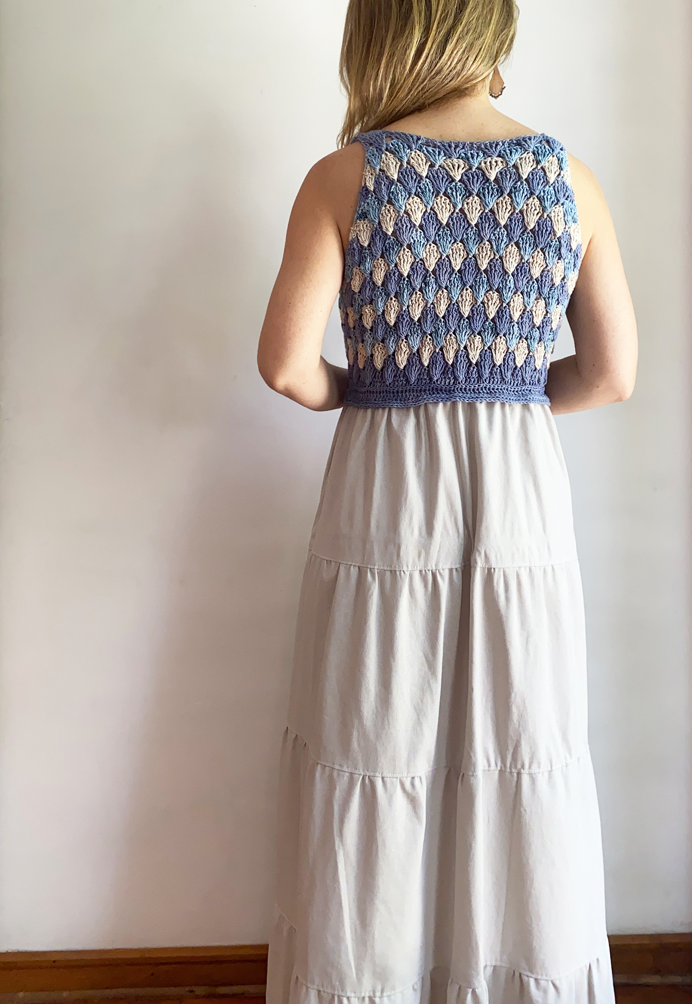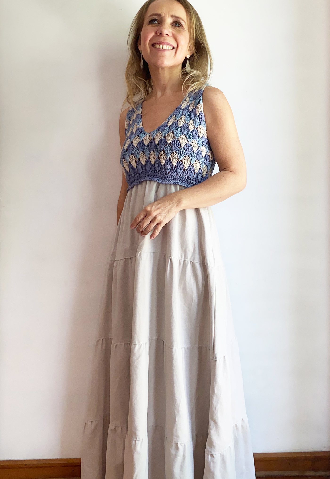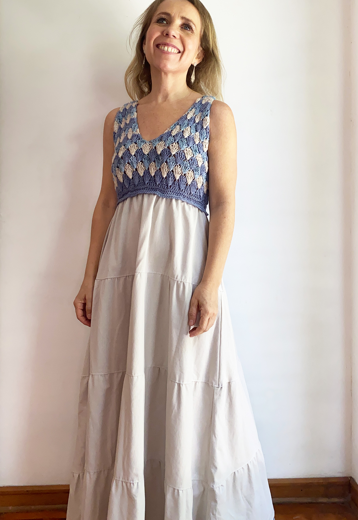 Este vestido es ideal para talla M/L, ya que su parte superior tejida se adapta al cuerpo con suavidad, ofreciendo un ajuste flexible y cómodo.