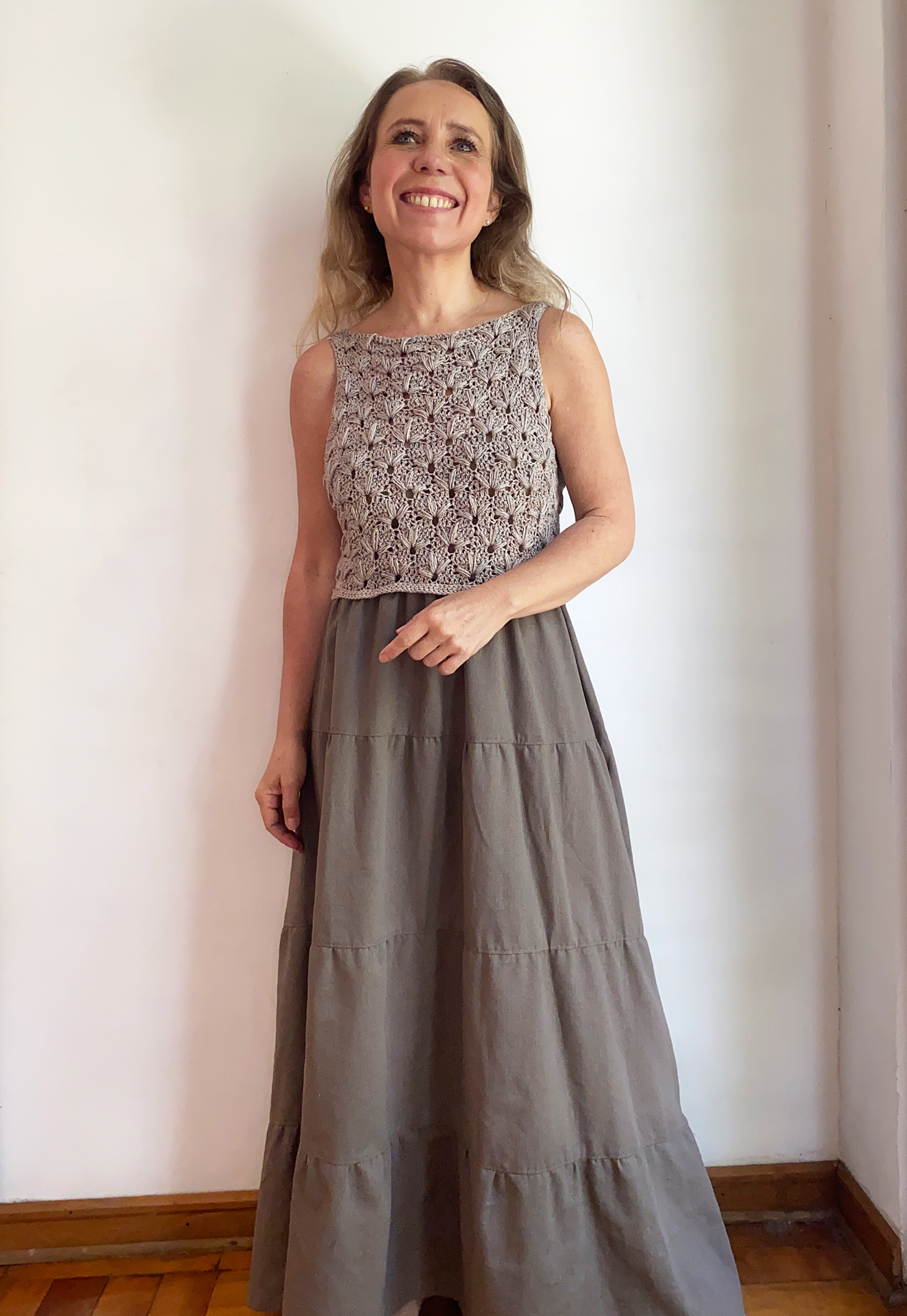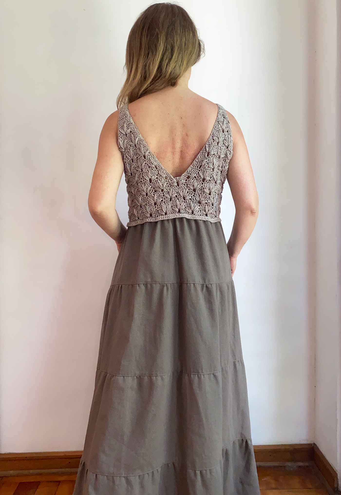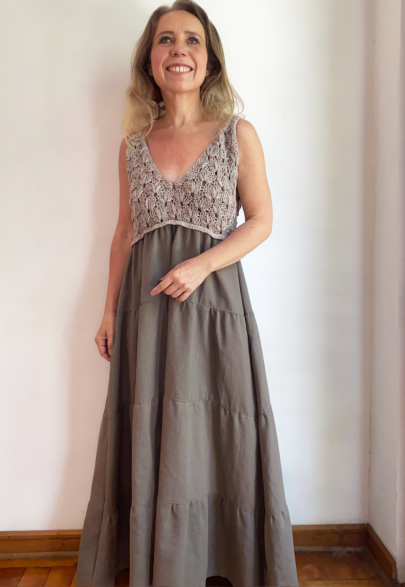 Este vestido es ideal para talla M/L, ya que  su parte superior tejida se adapta al cuerpo con suavidad, ofreciendo un ajuste flexible y cómodo.