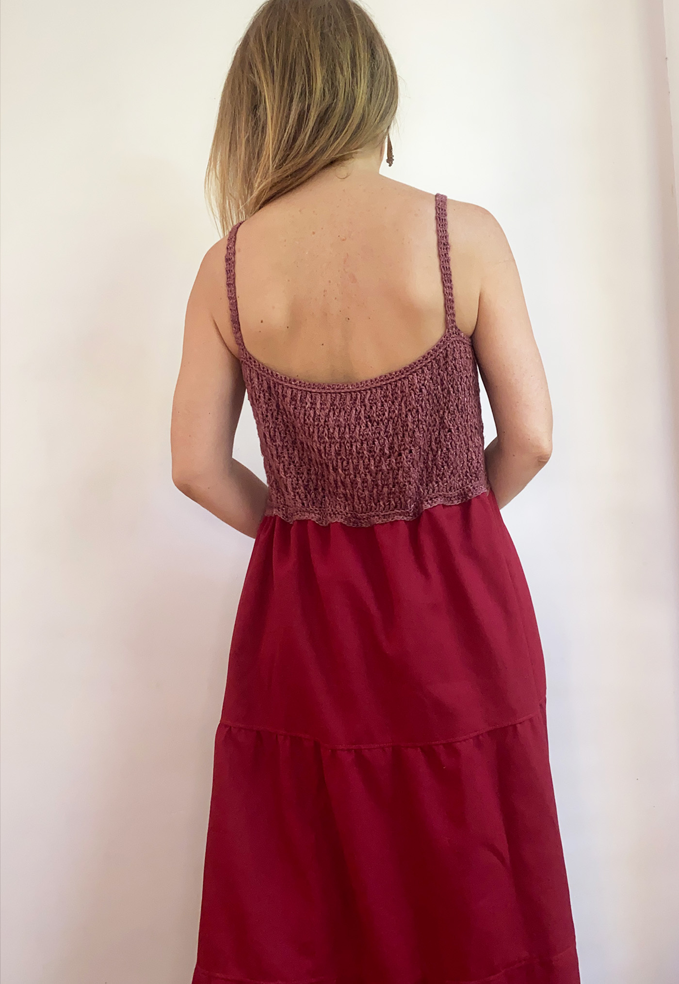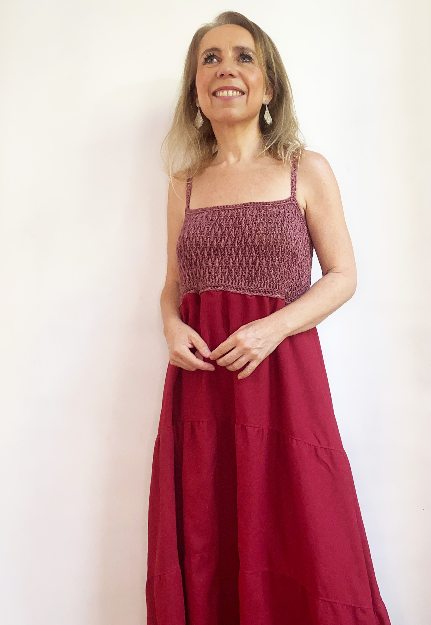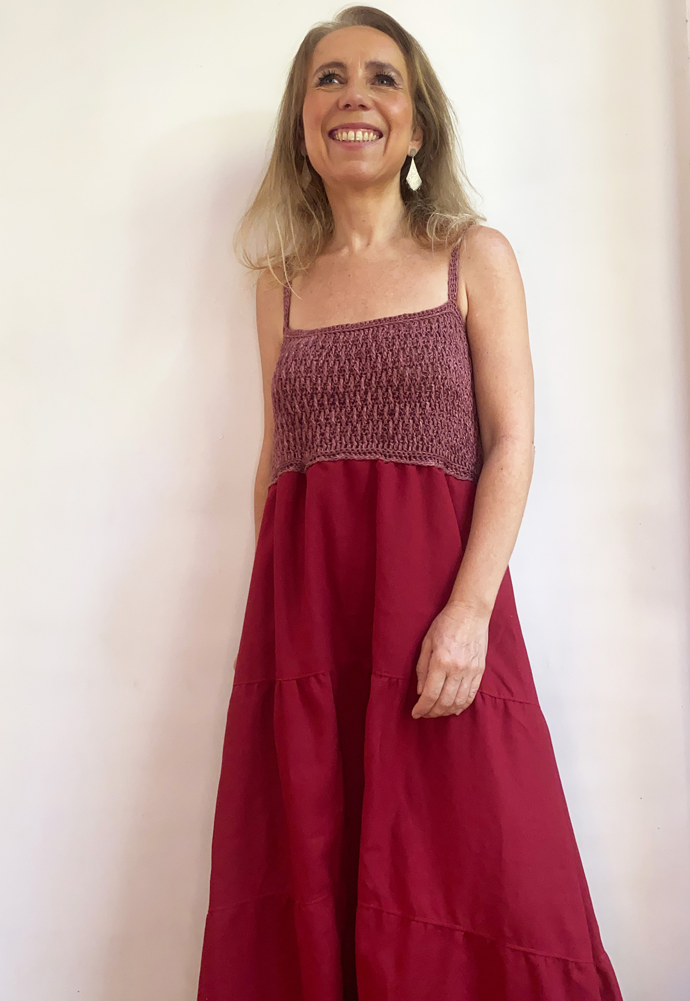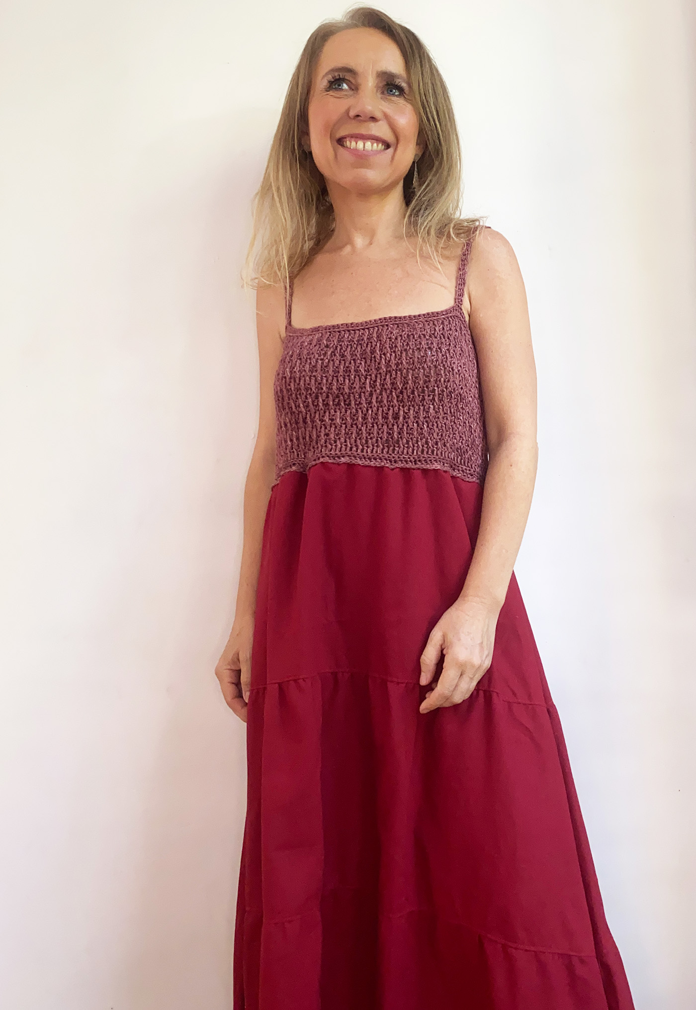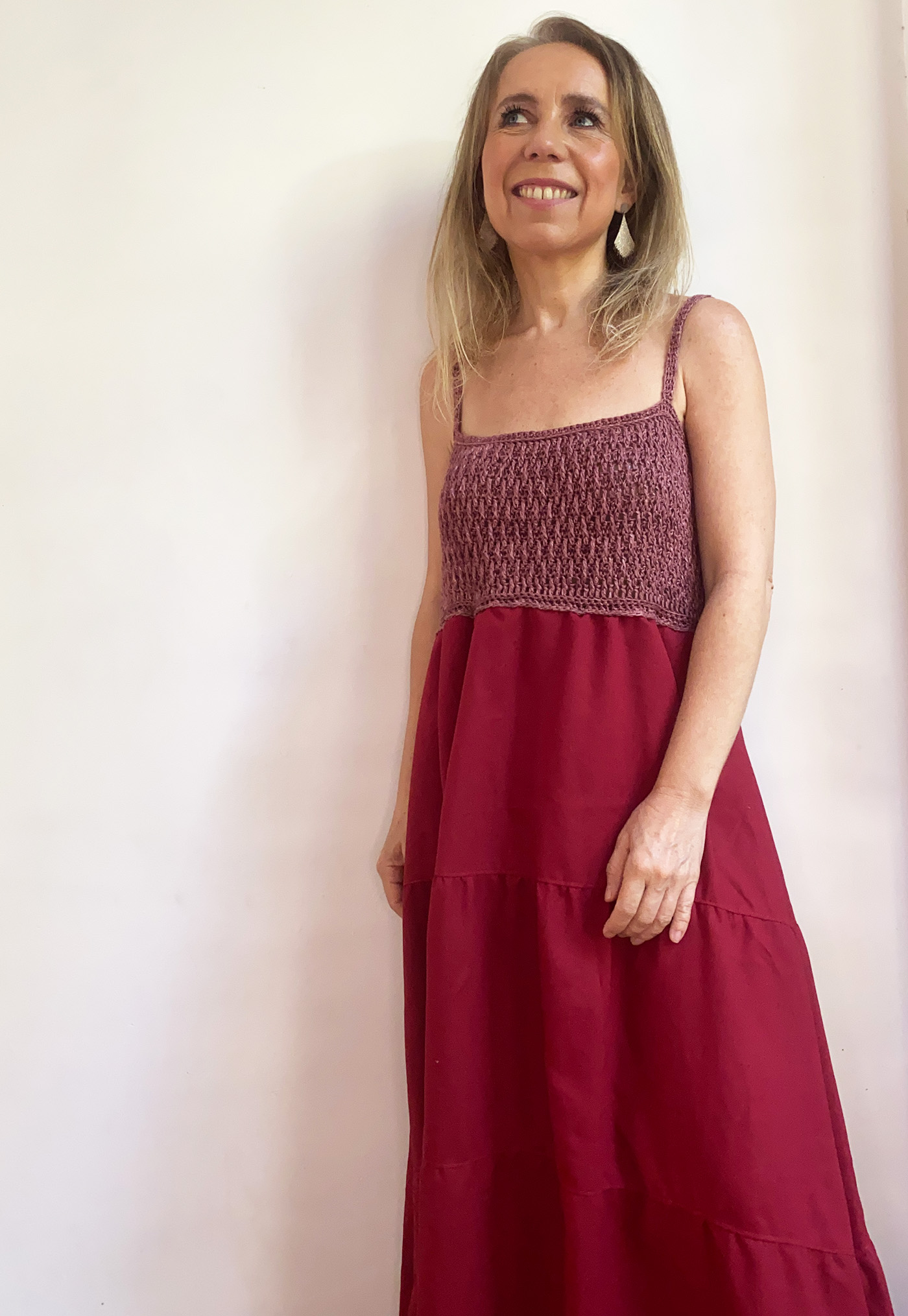 Este vestido es ideal para talla M/L, ya que su parte superior tejida se adapta al cuerpo con suavidad, ofreciendo un ajuste flexible y cómodo.
