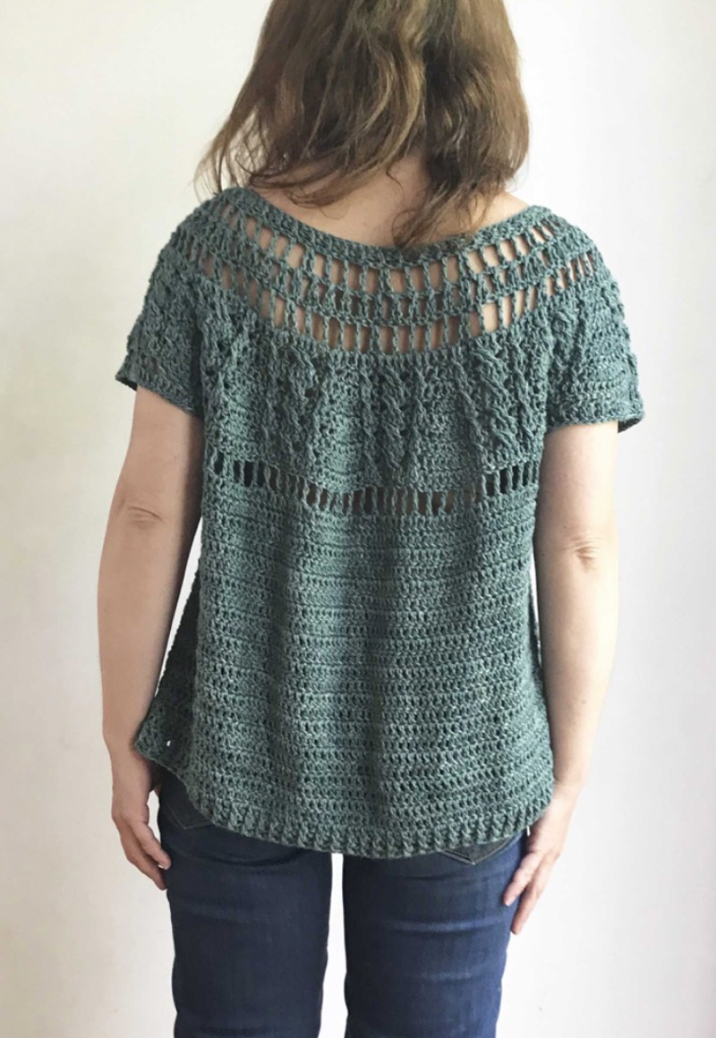 Es un modelo que sirve para tejer como polera o sweater, depende del hilado que uses. Yo lo tejí en algodón pima Sami (color Fossil) y lo dejé sin mangas porque es un hilado de verano.